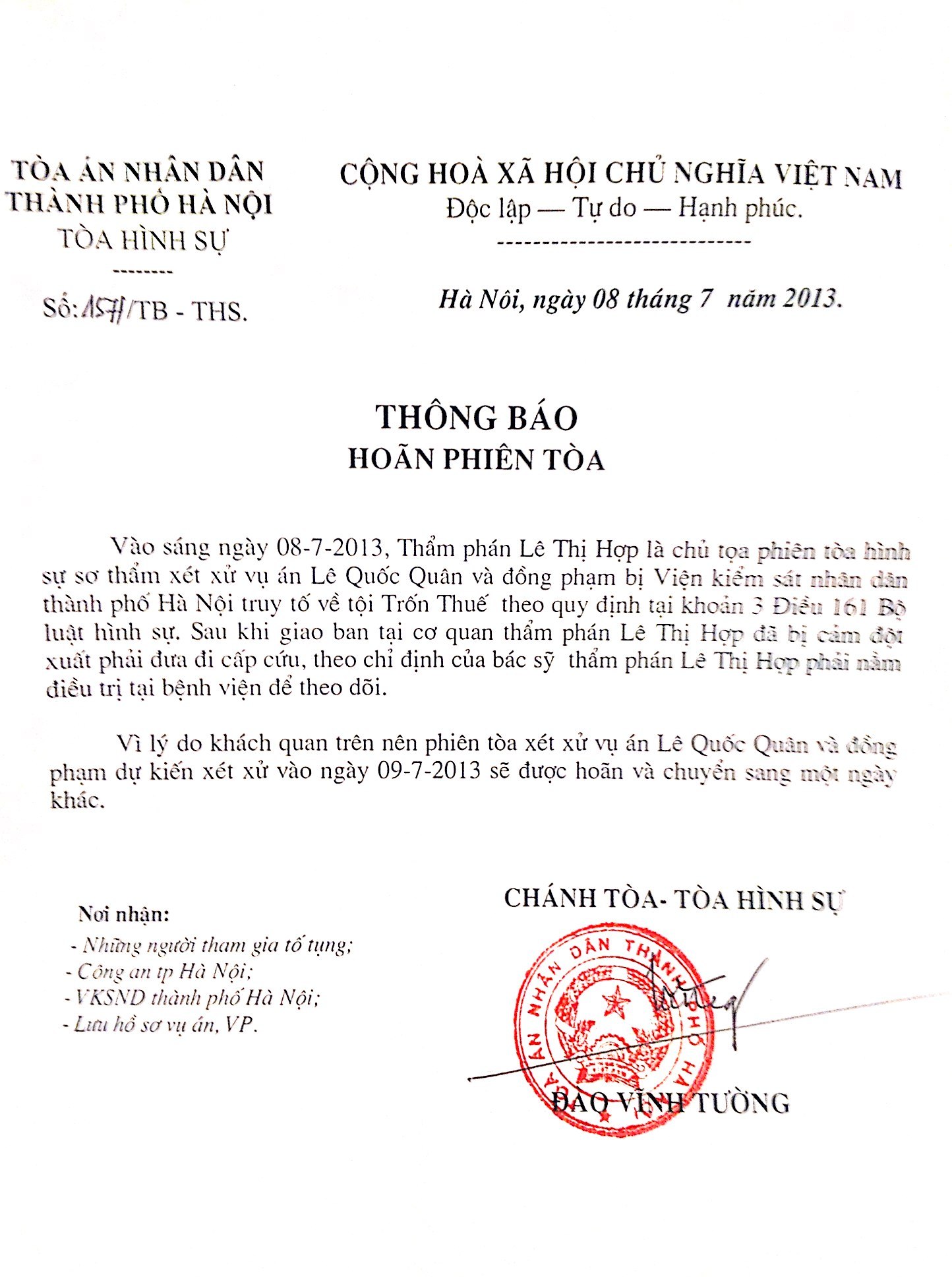 Như vậy, cuối cùng thì Tòa án Nhân dân Thành phố Hà Nội hoãn phiên xử